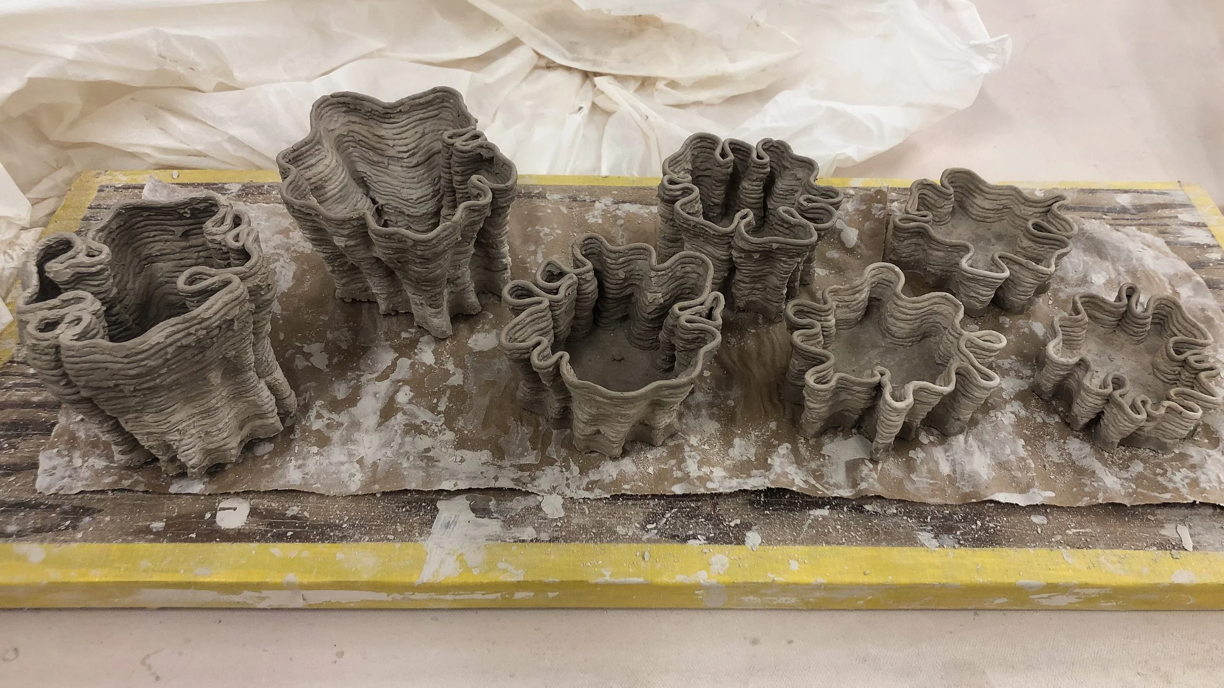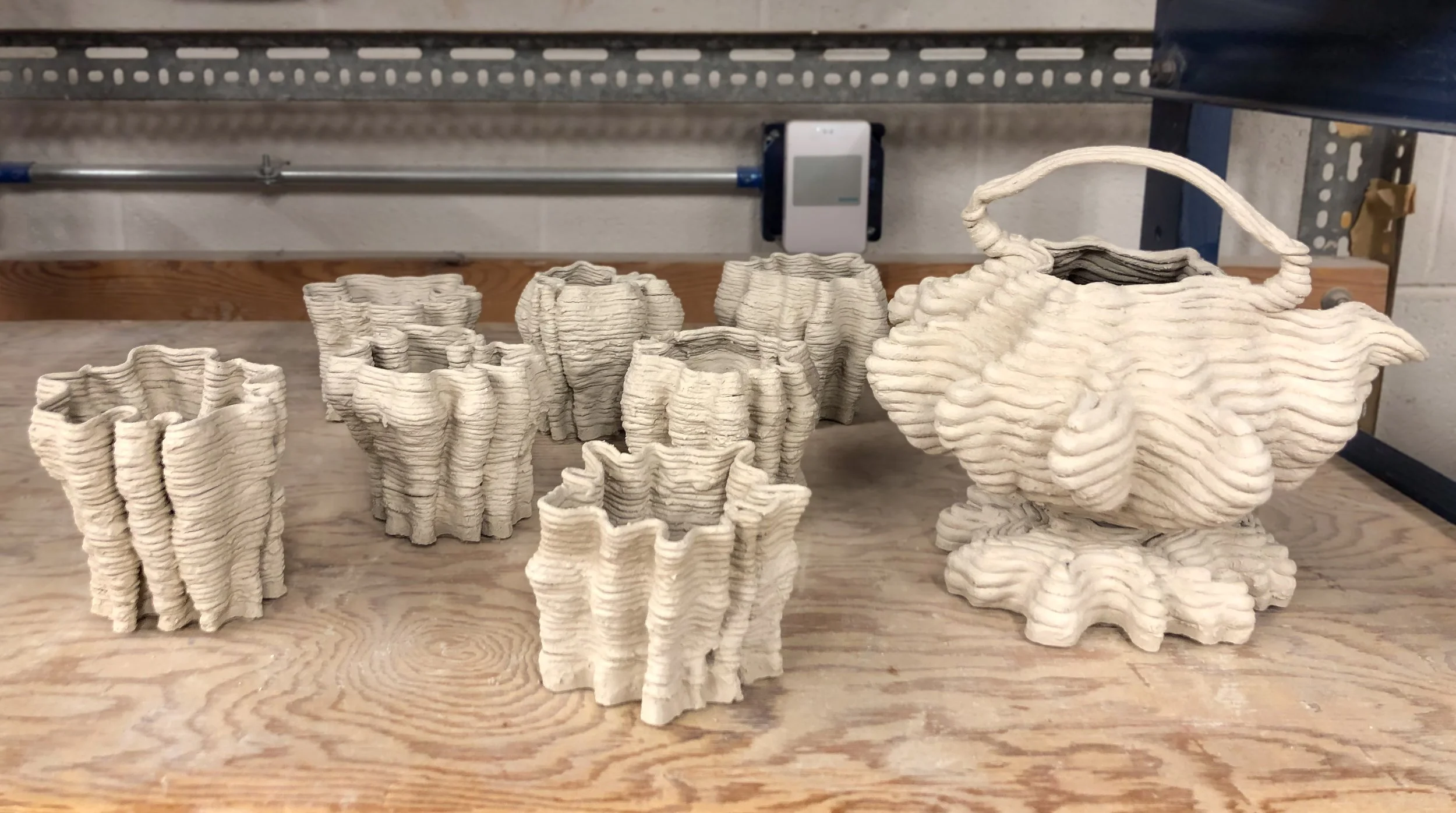 The ceramic tea set is built up from individual and irregularly outlined clay slabs. The unique profiles impact recognizability and expectations of use, without actively impeding common function.