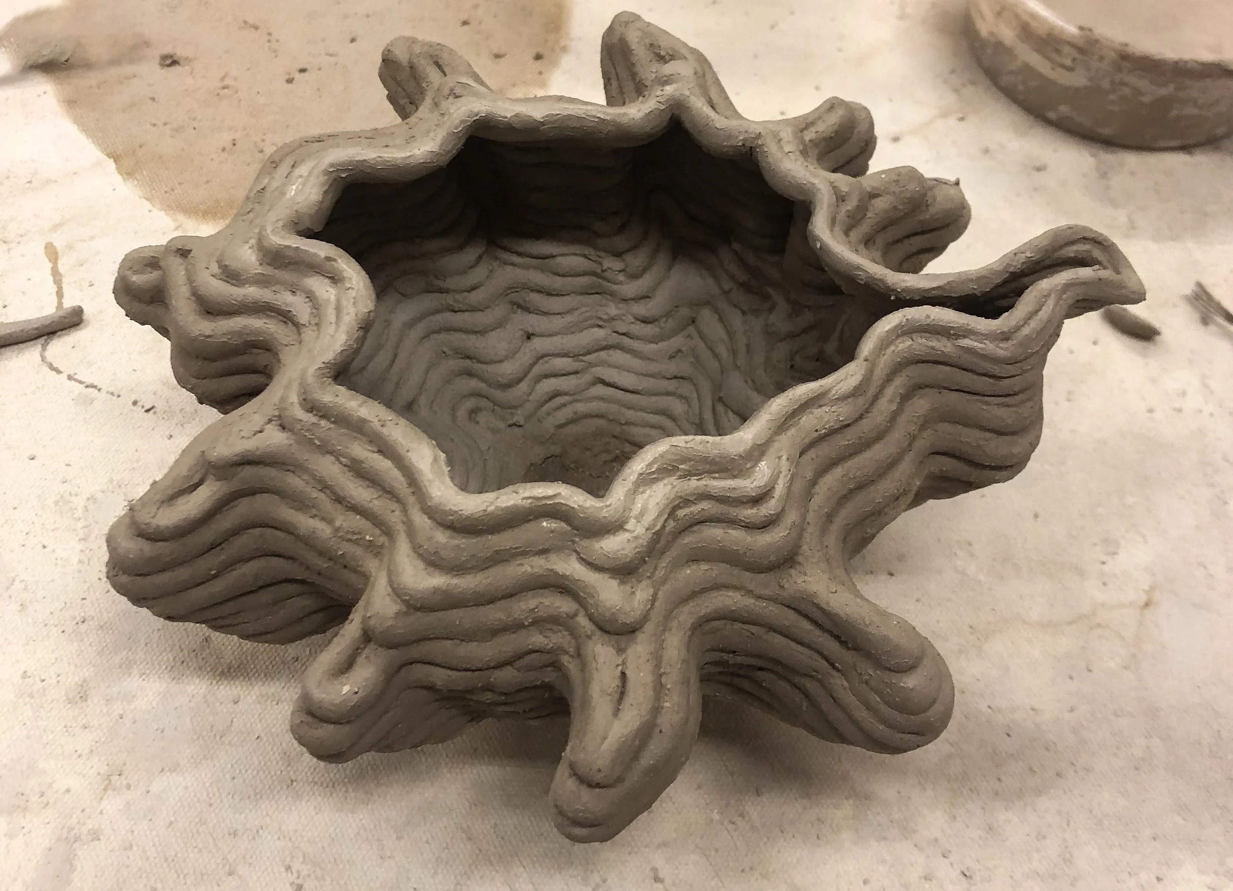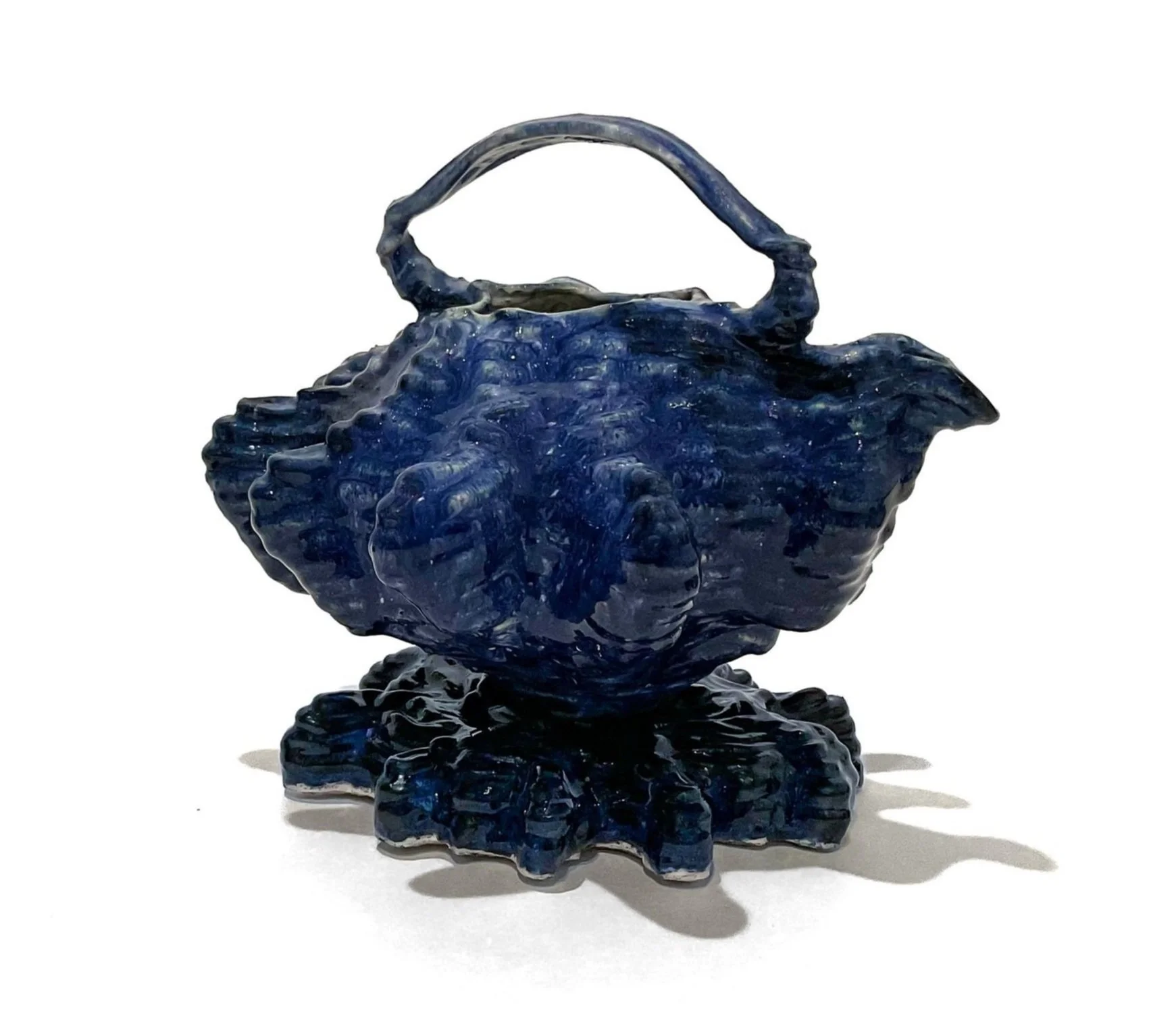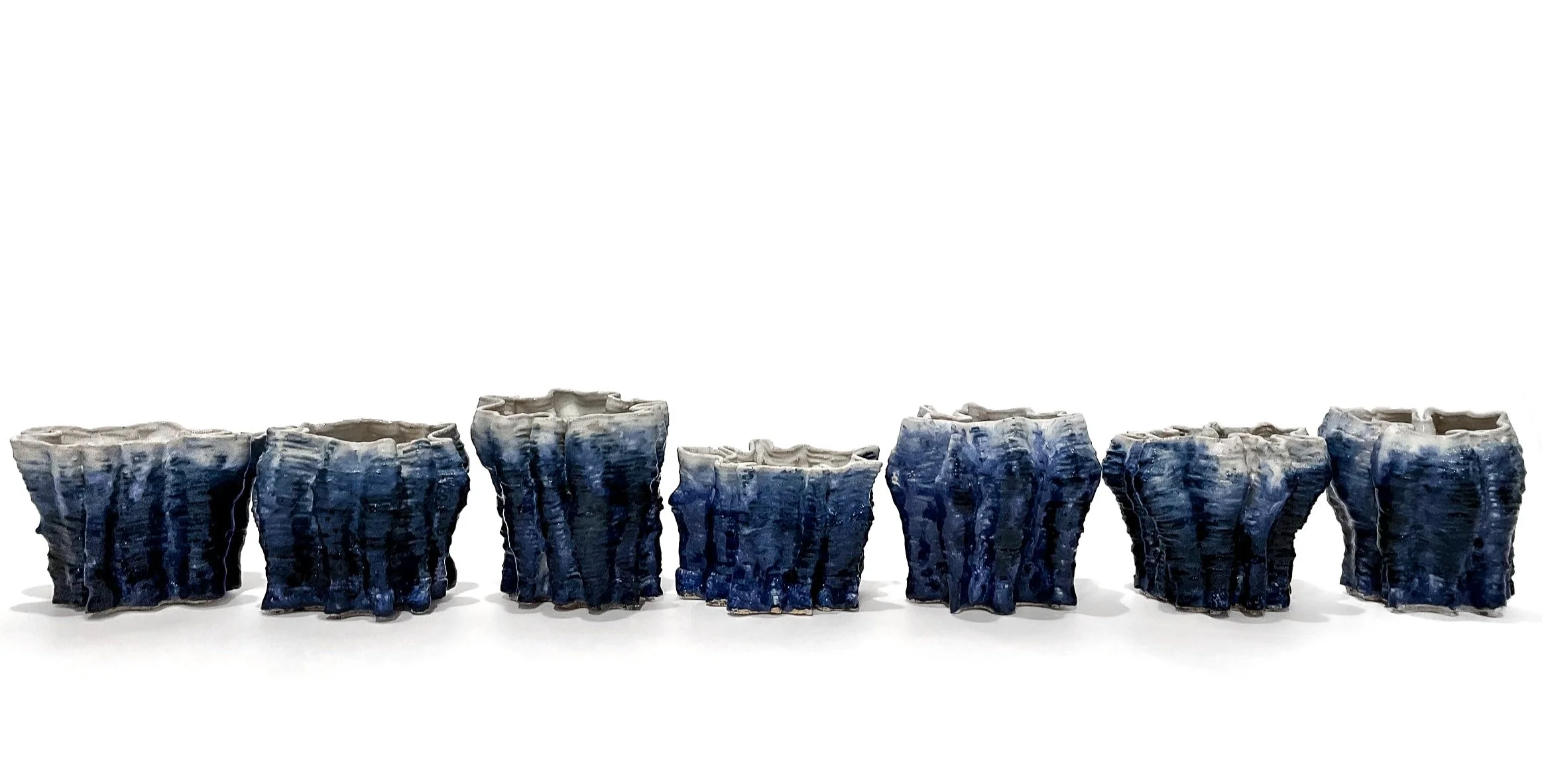 Constructed with coiled ceramics, gloss white glaze, and cobalt oxide overglaze.